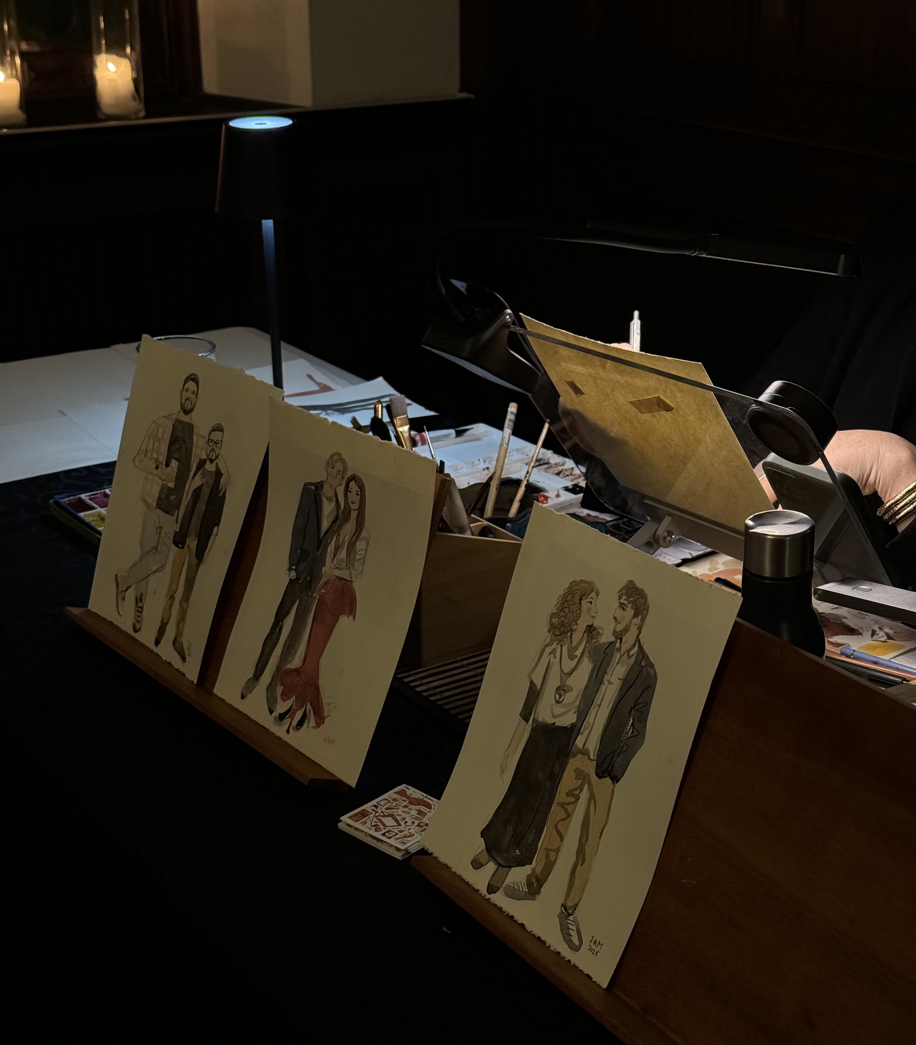 A refined artistic activation where an illustrator or painter captures the essence of the event in real time. Guests may be sketched individually or in pairs, or the artist may create editorial-style portraits, vignettes, or atmospheric scenes inspired by the evening. Each artwork is produced on site and offered as a one-of-a-kind keepsake -timeless, personal, and entirely unique.